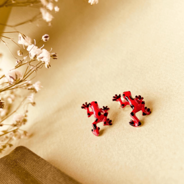 Aretes Rana Roja, lleva contigo al guardián del agua, siendo el dador de vida de toda la naturaleza. Joyas elaboradas en plata sostenible ley 925 pintadas a mano con pigmentos naturales. Libre de plomo y níquel. Joyas hipoalergénicas